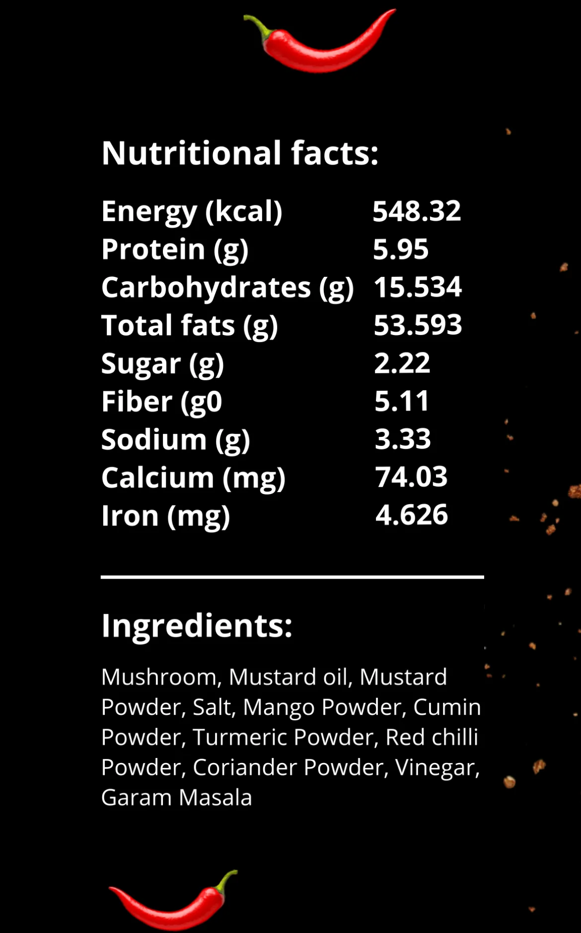 Experience the perfect balance of tangy, spicy, and umami, as the oyster mushrooms soak up the rich flavors of traditional Indian spices. Whether you're enjoying them as a side dish, a topping for your favorite sandwich, or a flavorful addition to your meals, Umami Kick will elevate your dining experience. Discover the magic of homemade pickles that are free from artificial preservatives and additives. Each bite is a celebration of natural flavors and wholesome ingredients.
